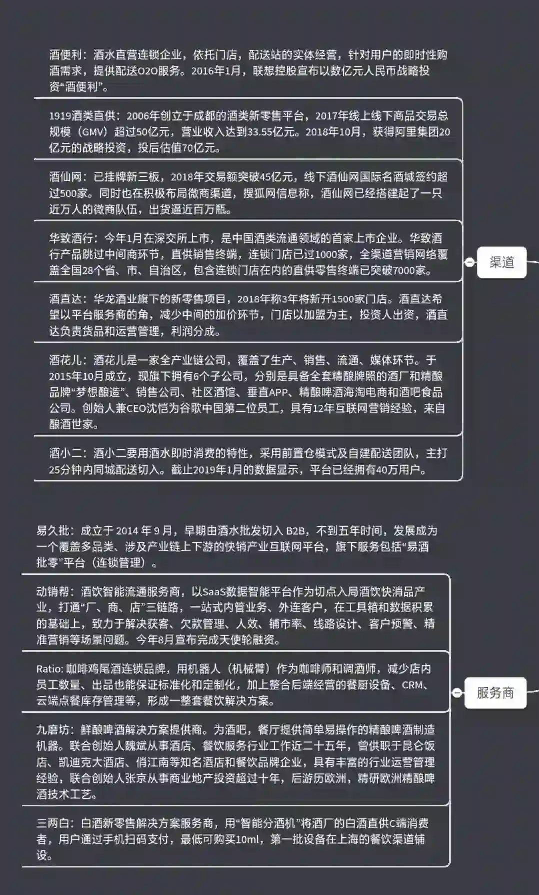 渠道之外,也有一些企业为品牌/渠道/供应商提供服务,比如成立于2014年的易久批,从酒品类切入B2B,后逐渐拓展至全品类服务;在餐饮渠道,也出现了“三两白”这样的零售解决方案服务商,用分酒机解决消费者的“来一小杯”需求。