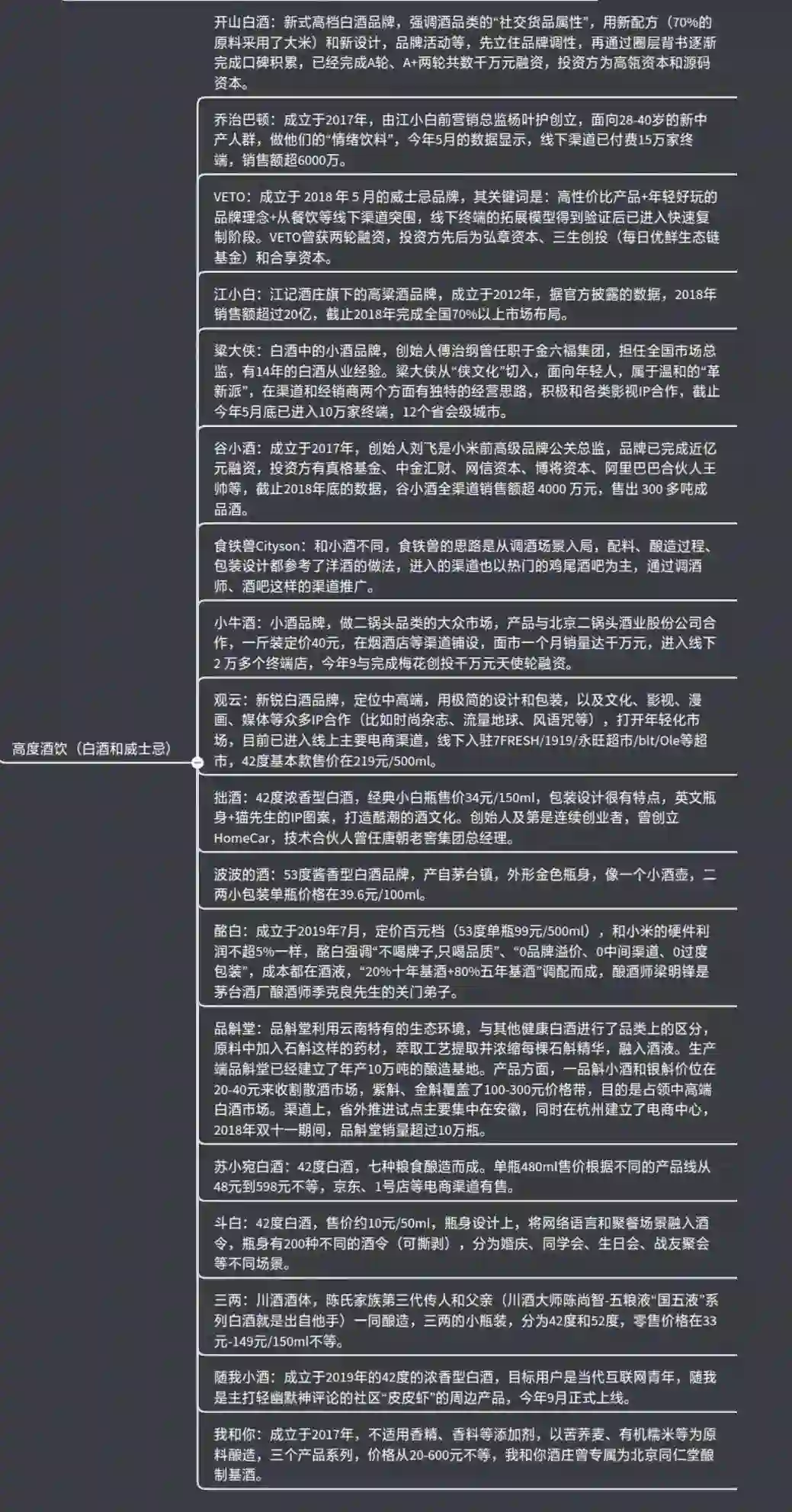 在高度酒饮的板块,据胡润百富发布的《2019中国酒类消费行为白皮书》,白酒的饮酒群体男性占绝大多数(75%),平均年龄在37岁,宴请和送礼是主要的消费场景。高端品牌积累口碑和品牌需要时间和文化沉淀,因此新品牌以小酒居多,可以观察到的现象是,小瓶装(2两-3两)的白酒成为小酒类普遍的包装选择。另外,也有主打中高端市场的新品牌,比如开山、观云,做威士忌的VETO。而白酒品牌在营销端都会强调“口感”,这和消费者的决策是分不开的。