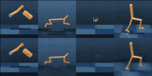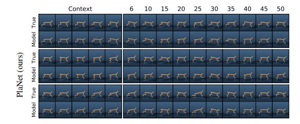 PlaNet 智能体在多个任务上进行训练的预测视频。经过训练的智能体收集信息过程展示如上,下方是 open-loop 幻觉智能体。万能智能体将前 5 帧视为上下文语境来推断任务和状态,并在给定一系列动作的情况下准确预测往后的 50 个步骤。