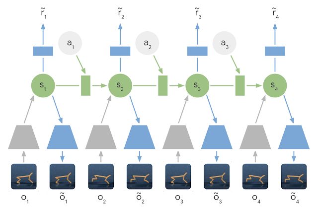 潜在动态学习模型:在潜在动态学习模型中,输入图像的信息将通过编码器网络(灰色梯形)集成到隐藏状态(绿色)中。然后隐藏状态再向前映射以预测未来的图像(蓝色梯形)与奖励(蓝色矩形)。