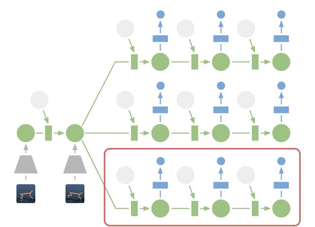 潜在空间中进行规划:为了进行规划,我们将过去的图像(灰色梯形)编码变为当前的隐藏状态(绿色)。据此我们有效预测多个动作序列的未来奖励。请注意上图里基于过去图像的图像解码器(蓝色梯形)是如何消失的。最后通过执行找到最佳序列的首个动作(红色框)。