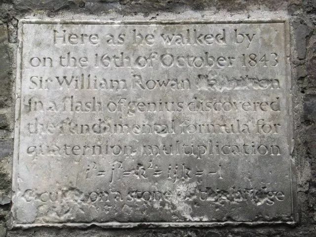 的方程解。之后哈密顿立刻将此方程刻在附近布鲁穆桥(Brougham Bridge,现称为金雀花桥 Broom Bridge)。这条方程放弃了交换律,是当时一个极端的想法(那时还未发展出矢量和矩阵)。