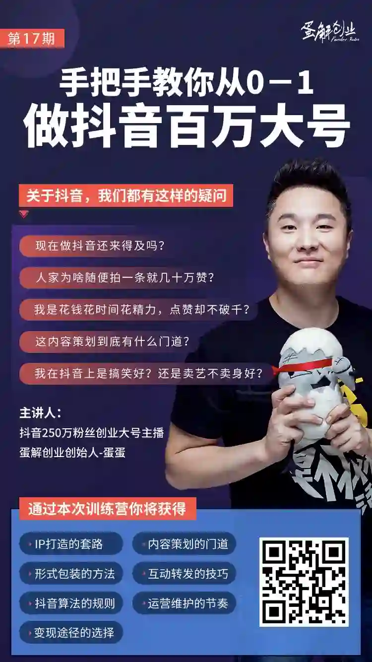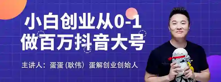 从定选题,找到用户真实存在的问题,量化课件和讲授方式,蛋解把自己做抖音的经验和方法论总结成了一套真实有效可实操的小白抖音运营课程《小白创业 从0~1做抖音百万大号》。