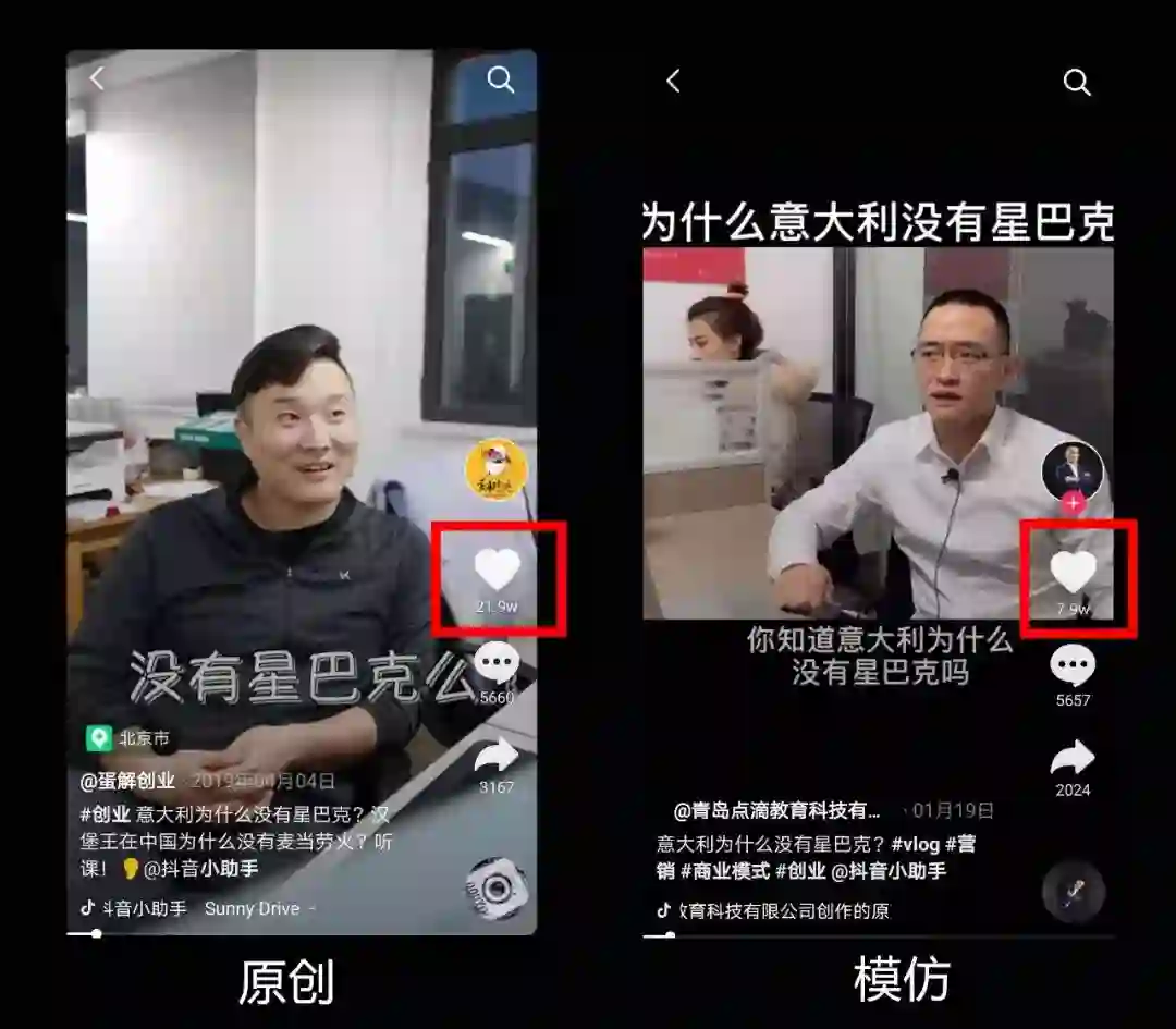抖音没有对内容版权有过高的限制。比如这两条视频,第一条讲的意大利为什么没有星巴克,火了,有21.9W点赞。第二条照着内容拍了一篇,形式都一样,也获得了7.9W点赞。