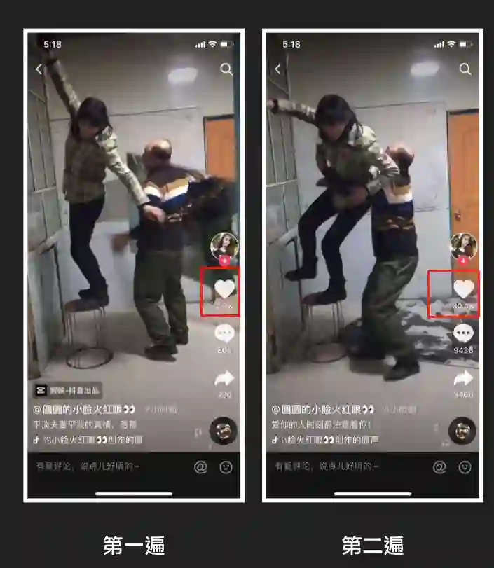 圆圆的小脸火红眼这个账号就是同一条视频发两遍,第一遍点赞2.3W,第二遍点赞30.4W。