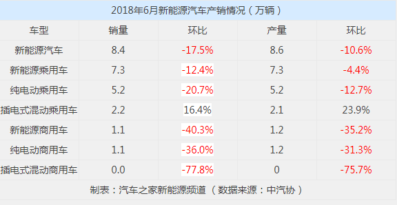 由于补贴政策从6月12日开始执行新的技术标准和额度,因此,6月份的数据能直观反应补贴变化后的市场情况,当月新能源汽车销量和产量分别为8.4万辆和8.6万辆。具体到各个细分领域,除了插电式混动乘用车市场以外,其他领域无一例外出现月度下滑。