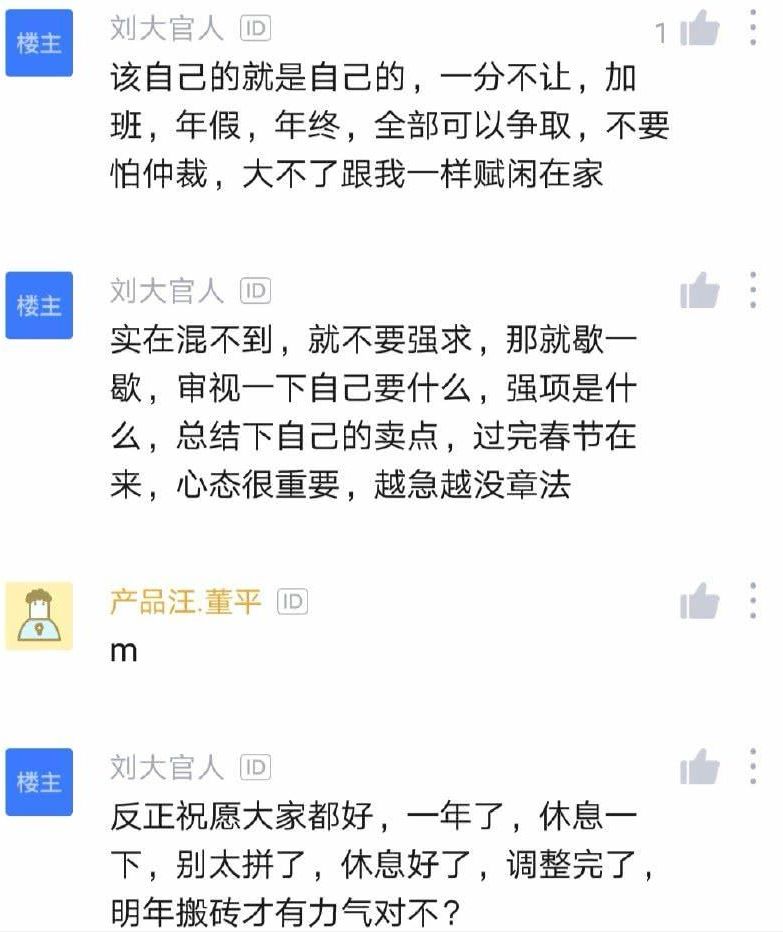 担心过年得给老板电话拜年,给同事微信拜年,免得影响关系,现在不一样了,拜年出于感恩,不在担心出问题,不在慌张的赶回来上班,总结了下现在面临的问题,社保续缴,然后没了,剩下的找工作这件事,过完年再说,现在做的是弥补下这么多年对家人的亏欠。现在看这里,老少爷们儿么不是被辞退就是被离职,我的看法是,不要着急,稳住心态,能混到过年就过完年,混不到就一边看着一边慢慢办手续,该自己的就是自己的,一分不让,加班,年假,年终,全部可以争取,不要怕仲裁,大不了跟我一样赋闲在家。