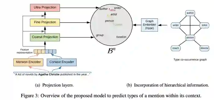 在命名实体识别(Named Entity Recognition,NER)上,我强烈推荐Lopez等人的文章“Fine-grained Entity Typing in Hyperbolic Space”[29]。使用可能涉及的实体&实体类型的二维列表(flat list),作者构建了一个双曲嵌入空间,来推断涉及的上下文,并将一个实体类型赋予给一个实体。例如,给定一个句子“A list of novels by Agatha Christie published in …”,其中“Agatha Christie”将不仅被标记为“human”,同时在更细粒度上会被标记为“writer”类中。实际中,这个框架在UltraFine数据集上的训练可以划分三级;在OntoNotes上,结果与SOTA方法旗鼓相当。