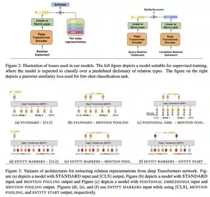 Soares等人[24]提出了一个关系学习的新方法——预训练一个大型模型(例如BERT),将句子输入它的编码器获得关系的抽象概念,然后在例如Wikidata、TACRED或DBpedia等特定模式中进行微调来获得一个带有相应ID的真实的谓词。这种方法具有很大的现实意义。通常基于KG的信息抽取方法都是为特定的本体(ontology)而设定的,所以你有多少本体你就需要有多少任务。这里作者从所有方案中提取了一些普适性的关系,这些关系你可以加入到你自己的方案中,从而减少大量重复性工作。这种方法在zero-shot和few-shot任务特别管用,在训练数据非常有限的情况下使用这种方式可以显著地提高你的模型的精确度。