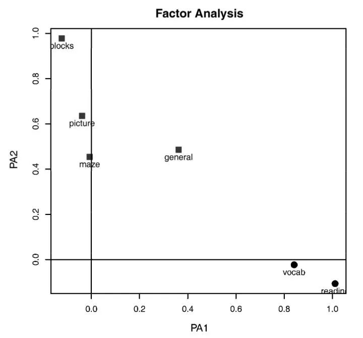可通过 factor.plot ( ) 函数来得到两因子图形,可从图中观测出不同初始变量在哪个因子上载荷更大。