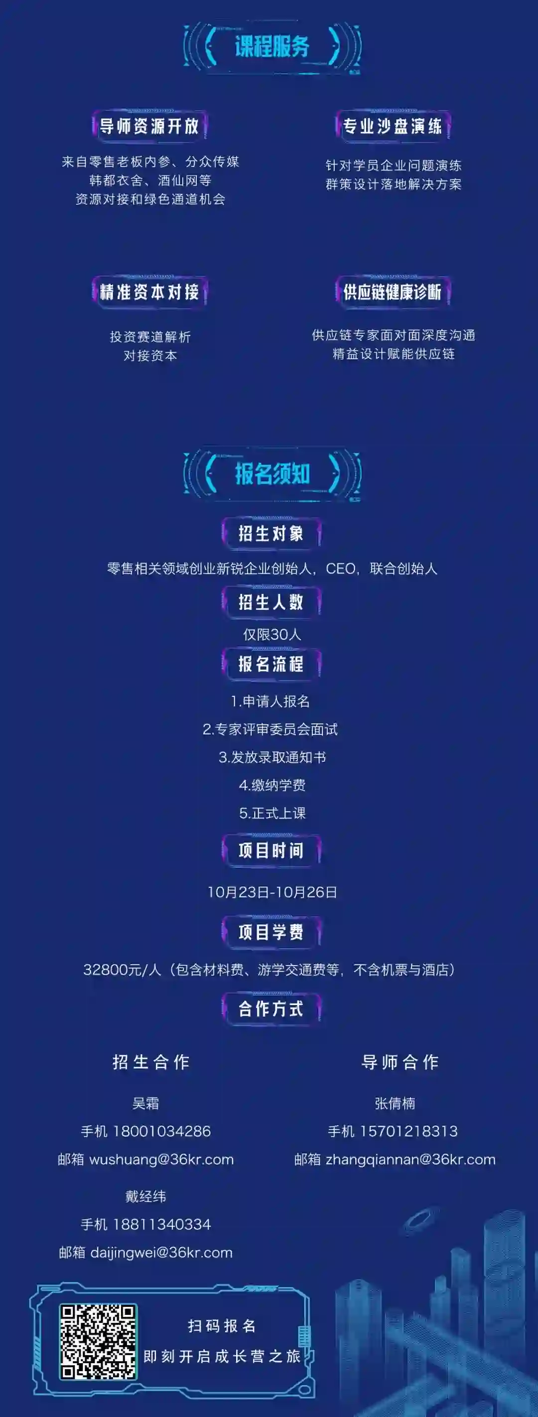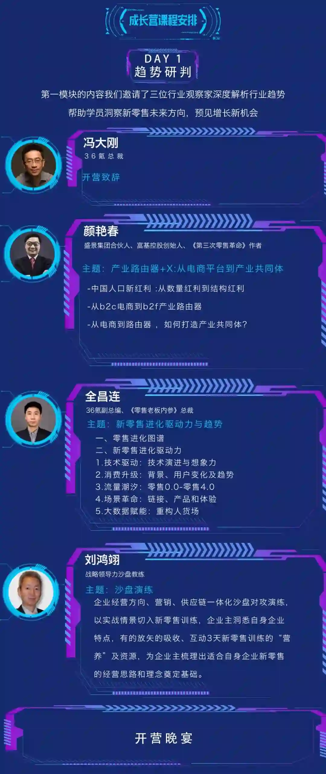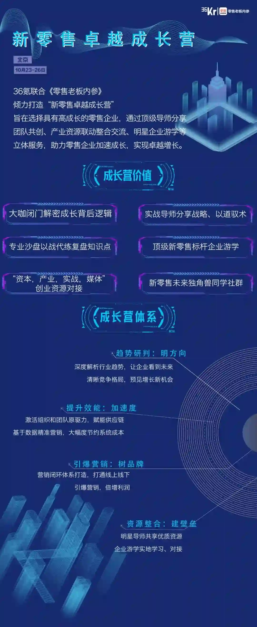 36氪联合《零售老板内参》联合打造的新零售卓越成长营,集合双方平台的行业大咖、实战导师、新零售社群与资本资源等,以闭门课程、实战演练、团队共创、明星企业游学的方式,助力新零售的企业实现卓越增长。