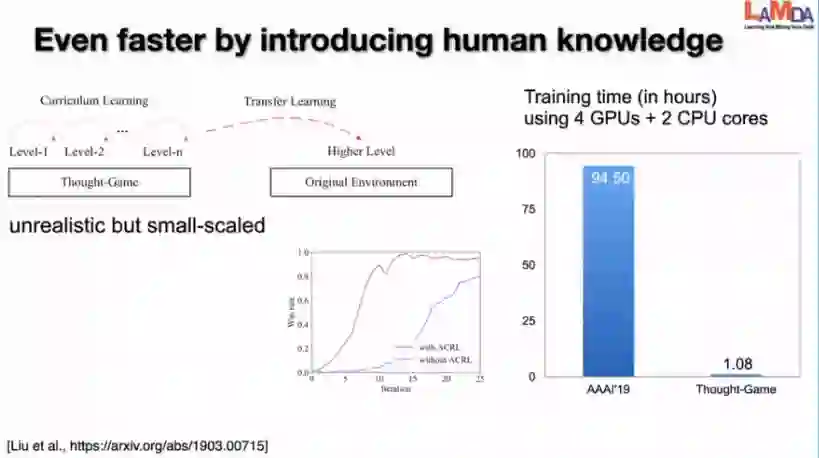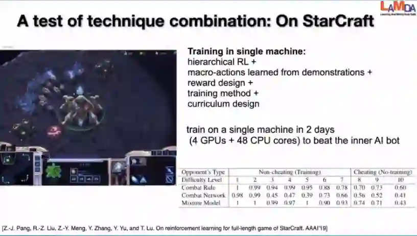 另外虽然人工的模拟器不是很准确,但是也能够给我们的学习进行加速。之前我们做过这样一个工作:在新机的环境下把各种强化学习的技术整合起来,来看我们能够把这个问题解决的多快。之前在19年的工作中,我们做过在训练两天后,能在一台计算机上面打败它的内置AI的这样一个实验。