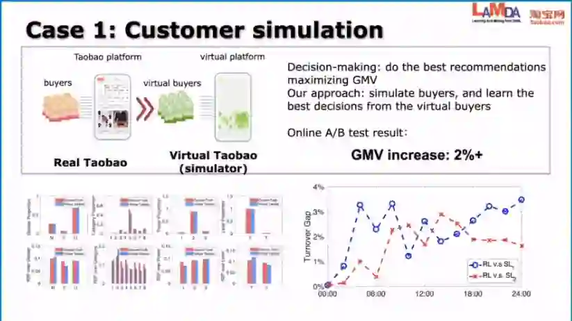 这里我们考虑到,对用户而言,实际上以什么样的顺序去呈现这个商品会带来很大的影响。我们想做决策,但是又不想去干扰真正的用户,所以我们这里的一个路径就是用历史上用户的数据来学一个模拟器出来。这个模拟器里面是虚拟的用户,所以我们在模拟器里面推荐一些商品以及商品的顺序出来,然后虚拟的用户就会来买,会点击或者是跳过去,那么我们就可以在模拟器上面去寻找怎样的方式能够有更好的销售,能够让用户有更好的体验。
