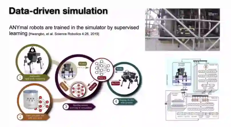 那么如何得到这样一个模拟器,如何让我们的模拟器能够和我们的真实环境对应上?实际上这并不是一个很新鲜的事情。我们可以看到在制造业和工业界里面有大量的模拟器的工作,所以以往的模拟器大部分是基于人类的知识来进行构造的,也就是用人工来构造的。里面包括比较常见的机器人控制、流体动力学、物流:我们可以把物流的整个场景虚拟的建模出来;上面这些已经有很多人研究了很多年,其实就是为了把里面的动力学模拟做的又快又准。