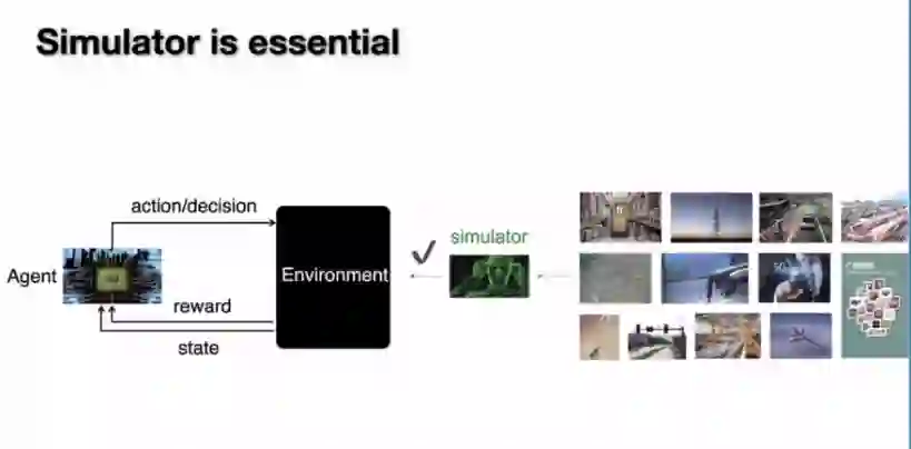 针对这样的情况,我们应该想些什么办法能够把强化学习用在真实的环境里面呢。其实有一个很简单很直接的一个想法,那就是使用模拟器,模拟器就是强化学习所运行的环境,通过它我们就可以把强化学习跑出来并得到一个很好的效果。