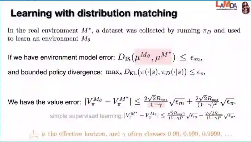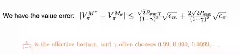 在公式右边我们可以看到是effective horizon 的平方,这实际上是一个很大的数,如果我们用这样一个方法去学一个模拟器出来,我们面临的问题就是当我们多走了几步以后,它的误差会迅速的放大,会导致我们最后学出来模型的策略很难用。