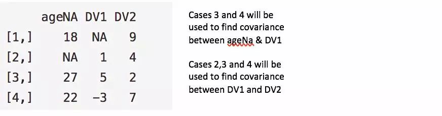 观测行3与4将被用于计算ageNa与DV1的协方差;观测行2、3与4将被用于计算DV1与DV2的协方差。