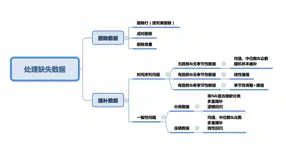 在前两种情况下可以根据其出现情况删除缺失值的数据,而在第三种情况下,删除包含缺失值的数据可能会导致模型出现偏差。因此我们需要对删除数据非常谨慎。请注意,插补数据并不一定能提供更好的结果。