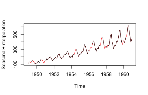 na.seadec(mydata, algorithm = "interpolation") # Seasonal Adjustment then Linear Interpolation