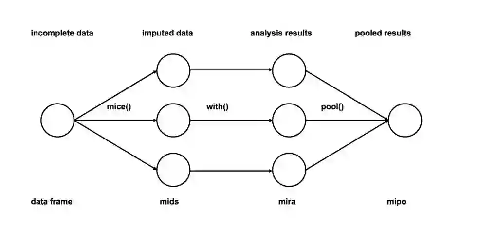 1、插补:将不完整数据集缺失的观测行估算填充m次(图中m=3)。请注意,填充值是从某种分布中提取的。模拟随机抽取并不包含模型参数的不确定性。更好的方法是采用马尔科夫链蒙特卡洛模拟(MCMC,Markov Chain Monte Carlo Simulation)。这一步骤将生成m个完整的数据集。