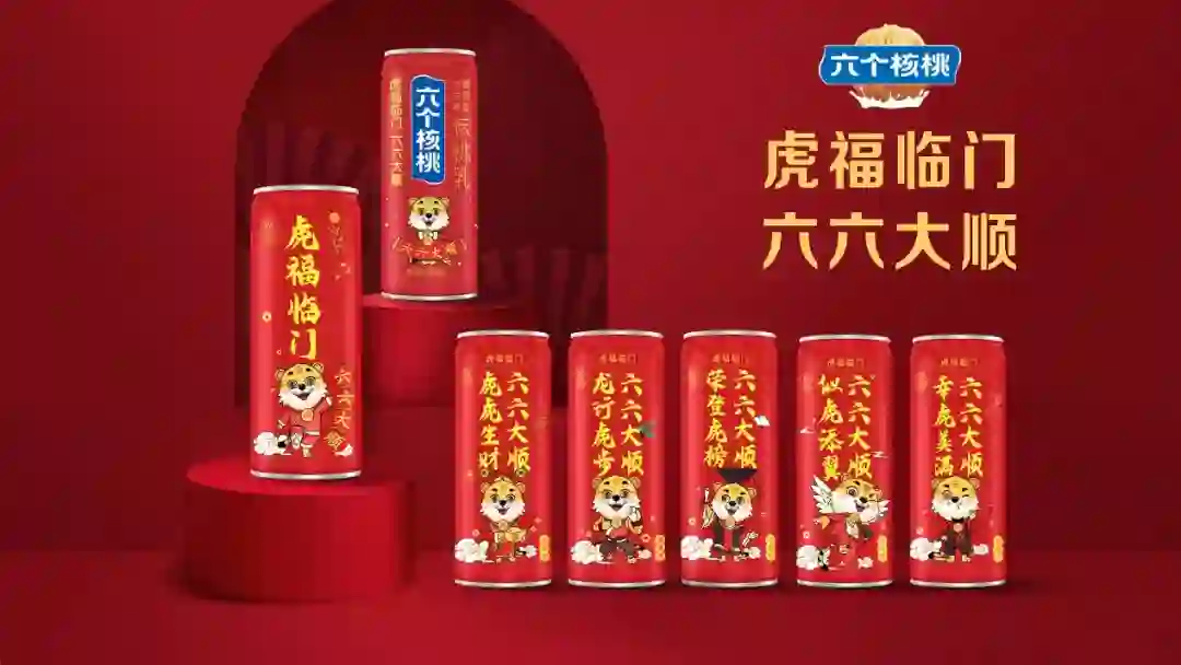 在饮料罐子和瓶子上进行春节定制并不是一件稀奇的事情,六个核桃也推出了虎年贺岁罐。