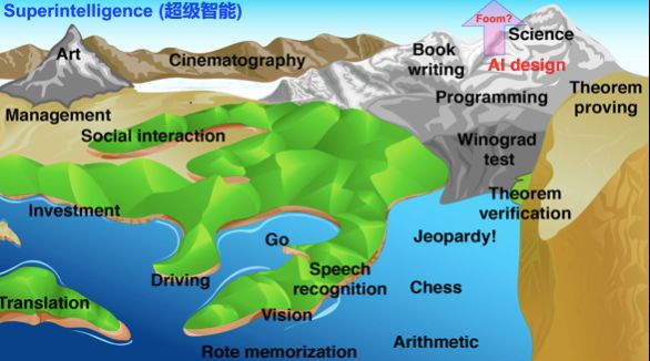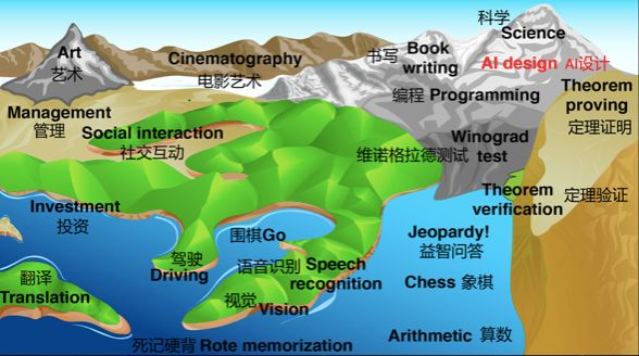 那么一个问题是:AI最终将上升到多高的地方?海面最终会将所有的陆地覆盖吗?像下面这张图这样,AI在几乎所有任务中都达到了人类水平?