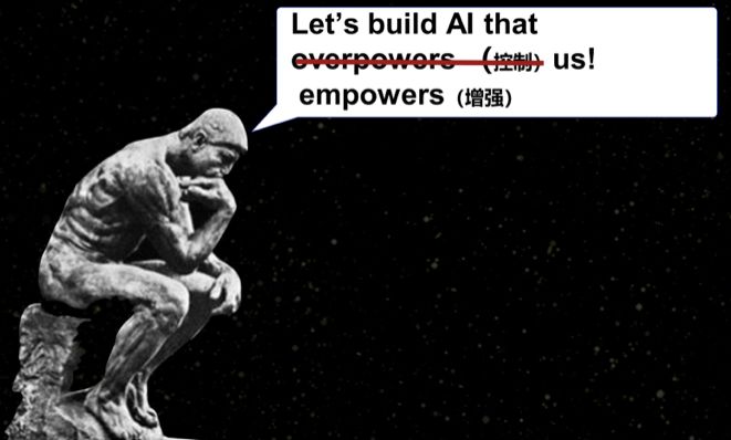 这就是我们面临的选择。我们可以满足于现状,也可以更有雄心一些,思考如何引领技术发展的方向,思考我们要去往怎样的未来,创造一个真正让人兴奋的未来。我认为未来我们不是被AI控制,而是AI会增强我们。
