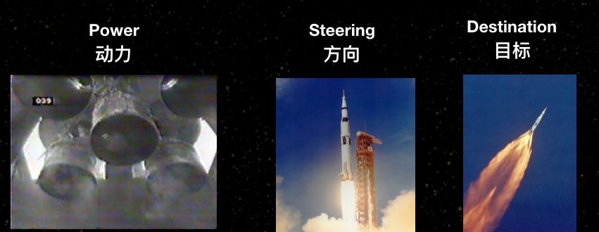 我们的世界是非常神奇的,我们知道如何明智地使用技术去实现我们的梦想。例如发射火箭,我们知道如何给火箭的方向定位,如何达到那个目标,所以我们就需要动力、方向和目标。