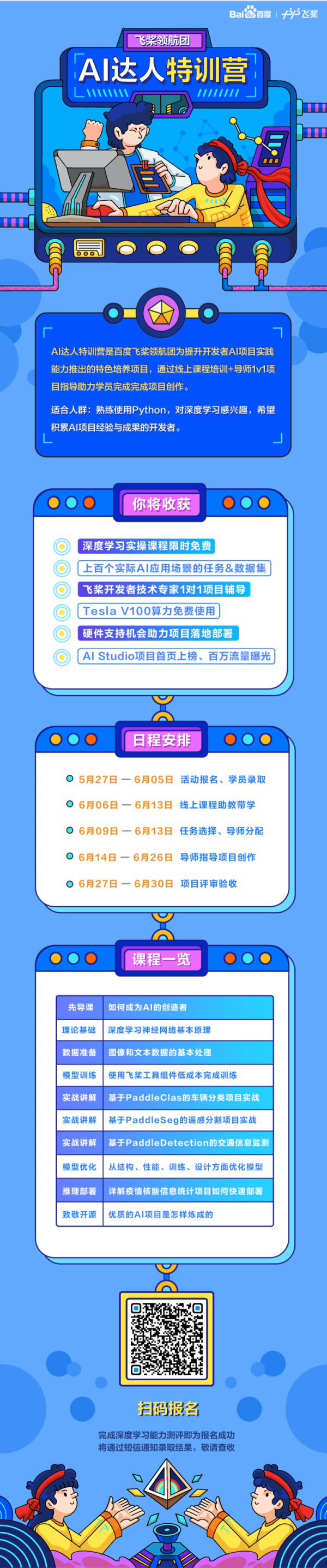 AI达人特训营面向所有有Python基础且对深度学习感兴趣的小伙伴开放,扫码并完成能力测试即为报名成功,我们将根据测试分数择优录取并分配任务和导师,录取通知将通过短信发送,敬请查收。