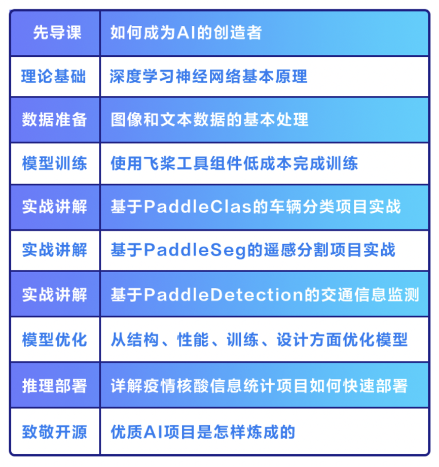 AI达人特训营是百度飞桨领航团为提升学生和在职开发者的AI项目实践能力推出的特色培养方案。通过线上课程培训+技术专家1v1项目指导,快速提升你的项目实践能力;更有上百个实际应用场景下的AI任务+数据集供你挑选实践,AI项目经验buff快速叠加,参赛拿奖触手可及。