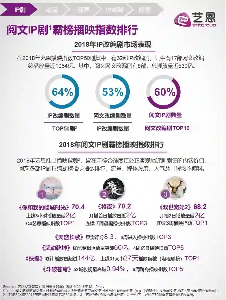 数据不会说谎。纵观2018年艺恩播映指数top50剧集中,有32部IP改编剧,其中17部网文改编,总播放量近1054亿,而其中,阅文网文改编剧有8部,总播放量近530亿。作为2018年阅文IP剧霸屏排行前三甲,《你和我的倾城时光》收视表现喜人,上线8小时播放量就破2亿;《将夜》还原度高,口碑算得上今年IP剧的前列;《双世宠妃2》则是标准的以小博大,又小爆了一把。