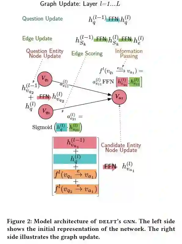 摘要:我们介绍了Delft,一个事实问答系统,它将知识图问答方法的细微和深度与更广泛的free-文本结合在一起。Delft从Wikipedia构建了一个自由文本知识图,以实体为节点和句子,其中实体同时出现做为边。对于每个问题,Delft使用文本句子作为边,找到将问题实体节点链接到候选对象的子图,创建了密集且覆盖率高的语义图。一种新颖的图神经网络在free-文本图上进行推理-通过沿边句子的信息组合节点上的证据-以选择最终答案。在三个问答数据集上的实验表明,Delft能够比基于机器阅读的模型、基于BERT的答案排序和记忆网络更好地回答实体丰富的问题。Delft的优势既来自于其free-文本知识图谱的高覆盖率--是DBpedia关系的两倍多--也来自于新颖的图神经网络,它基于丰富而嘈杂的free-文本证据进行推理。