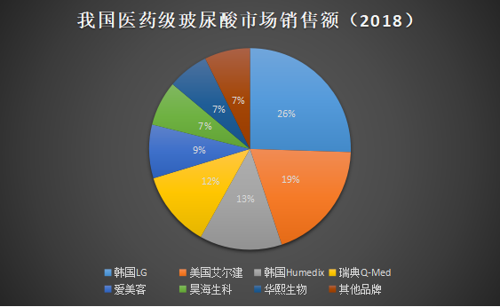 根据Frost & Sullivan,2018年我国医药级玻尿酸市场竞争之中,销售额排序分别是韩国LG(25.5%)、美国艾尔建(19.4%)、韩国Humedix(13.2%)、瑞典Q-Med(12.2%)、爱美客(8.6%)、昊海生科(7.2%)、华熙生物(6.6%)。位列榜首的韩国LG,销售额甚至超过了国内“玻尿酸三巨头”的总和。