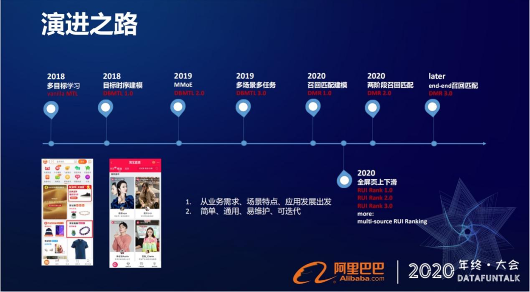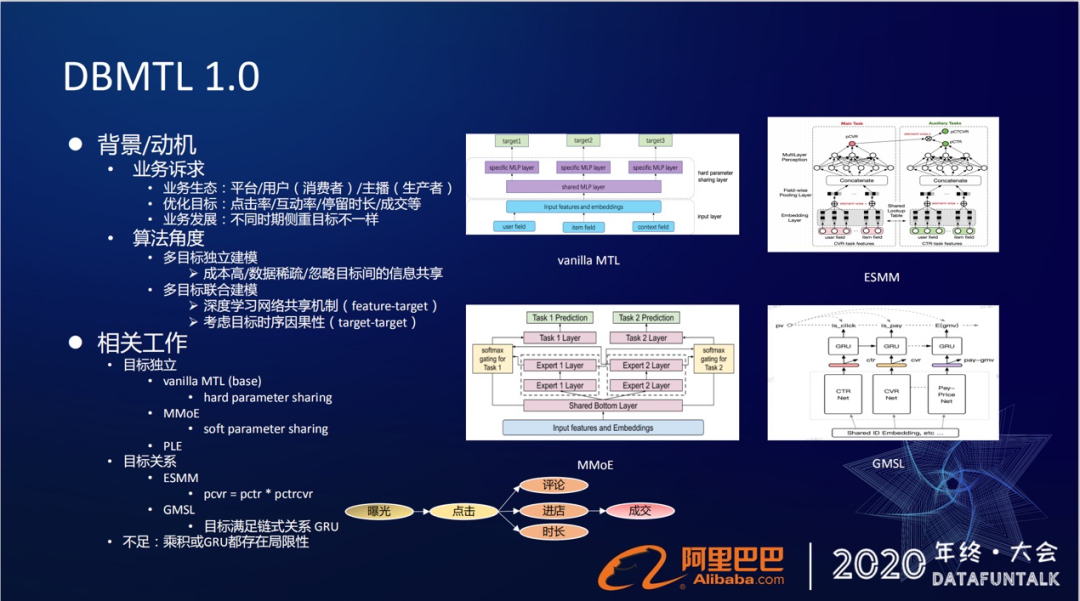 上图的时间轴,展示的是从2018年至今,淘宝直播做的排序优化工作。从2018年开始,我们就将排序模型升级到了原生的多目标学习框架MTL ( Multi-task Learning )。在2018年底我们基于目标持续建模,提出了自己的多目标学习框架DBMTL,2019年结合MMoE对框架进行升级,又做了多场景多任务的网络框架。今年围绕着召回匹配建模做了DMR架构,还做了两阶段召回匹配的模型,这些是我们在淘宝直播的列表页信息流下做的一些优化工作。