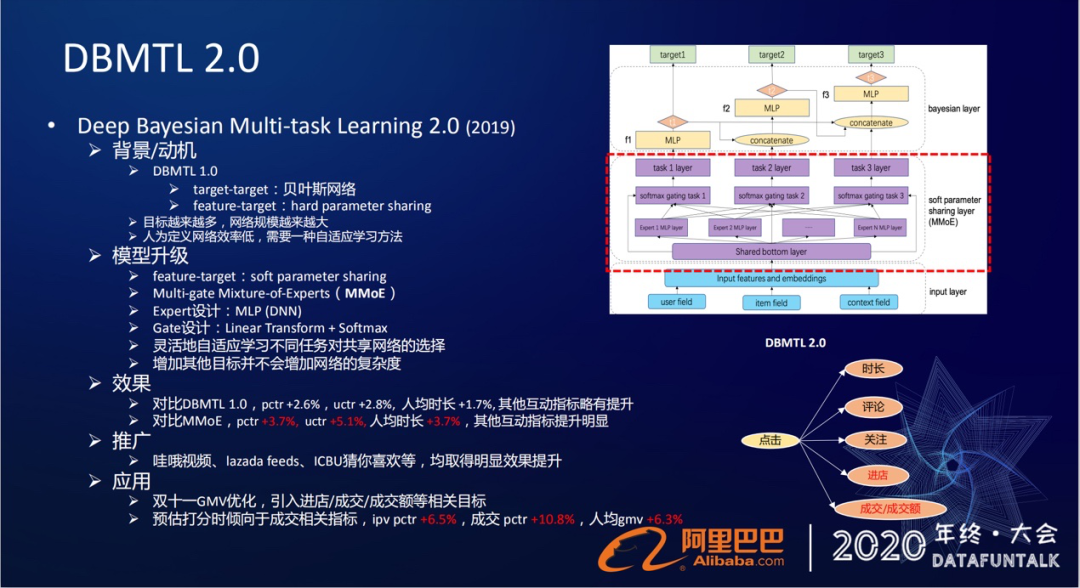 以上就是我们在多目标优化DBMTL框架下做的两点优化,一个就是在底层信息共享层MMoE替换原来的hard parameter sharing的方法,另外就是我们通过贝叶斯网络层去刻画目标之间的关系。