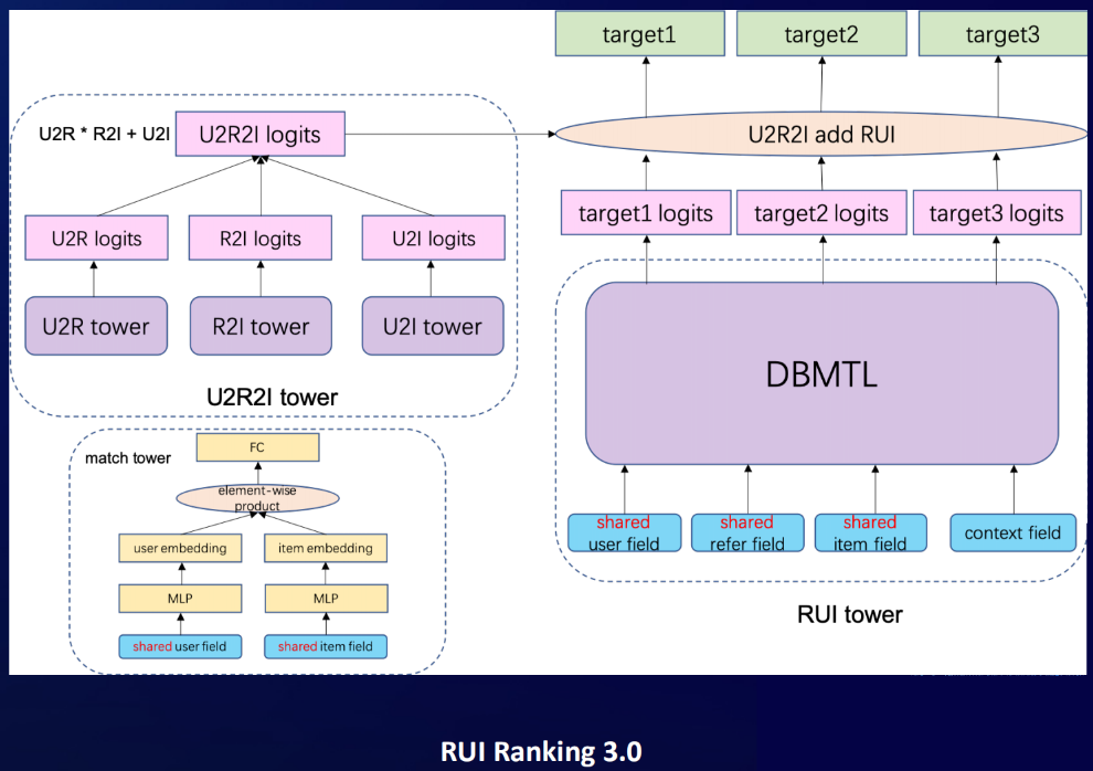 整个三元的关系刻画,通过公式来表达就是 u2r*r2i+u2i。原来框架下左边的match tower现在换成了三个小塔,每个小塔还是点积的框架,每个小塔就分别去刻画这三者之中的两两之间关系,从左到右就是user2refer的关系,中间是refer2item,右边是user2item关系,然后在上层我们通过u2r*r2i+u2i公式来进行融合。