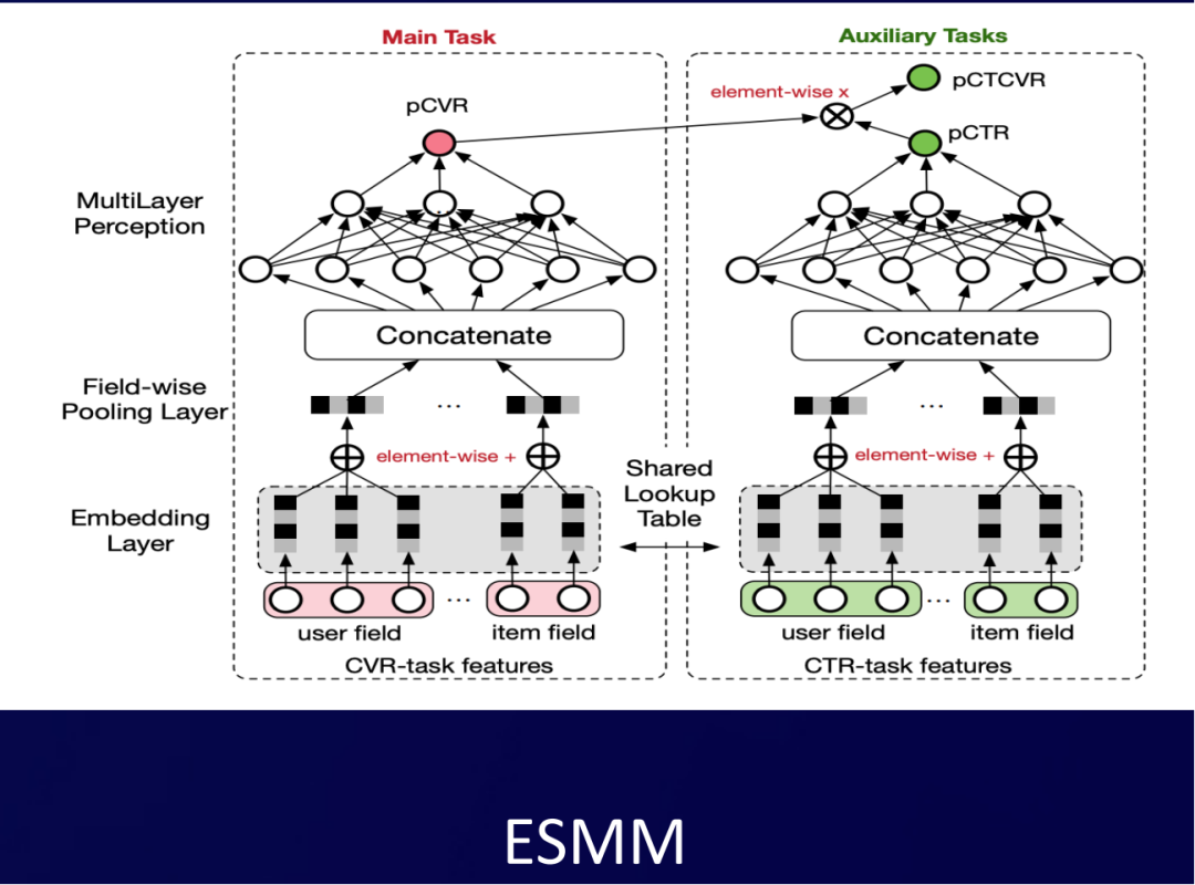 这张图是阿里巴巴的ESMM,它最初的一个目标是要去优化pCVR,然后通过引入pCVR=pCTR*pCTCVR这样的目标关系刻画,解决了样本选择空间偏差的问题,进一步优化pCVR。