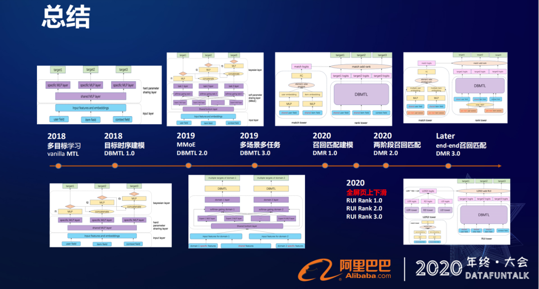 最后给大家做一下简单的总结,从2018年开始,我们的多目标的排序模型就升级到了深度学习的多目标学习框架,就是原生的这种Multi-task Learning,然后我们又基于目标的时序建模提出了DBMTL。2019年我们又结合MMoE,做了升级,之后我们又提出了一个多场景多任务的学习框架。