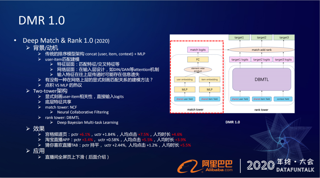 今年我们围绕着召回匹配建模提出了一个双塔的DMR框架,然后我们又做了一个两阶段的召回匹配学习。此外我们也在全屏页直播间上下滑做了基于业务特性上优化的一些工作。