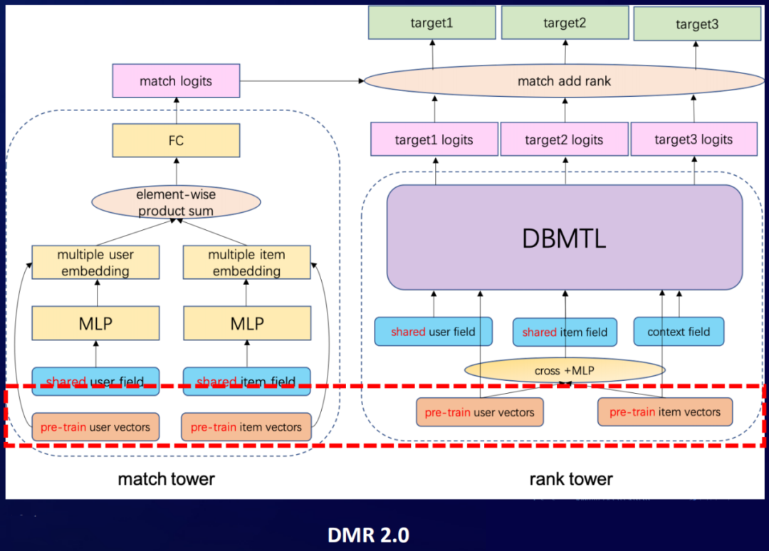首先,在match tower里面,因为我们在pre-train的这些向量已经在空间里面得到表征,直接喂到上面点积的操作就可以了。直接给他们做一个点乘的操作,然后再跟原来得到的这个embedding去做一个sum pooling或mean pooling,过FC,得到logits。在rank tower里,我们同样把预训练好的一些特征,输入到网络里面去。