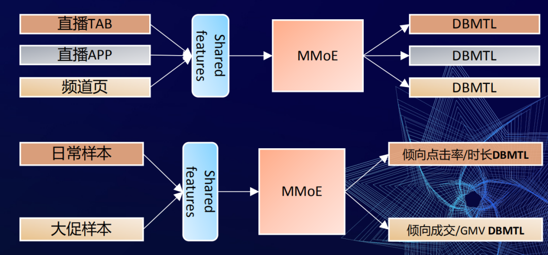 我们有3份样本,在每一个场景的样本里面,多个目标的loss做加权和迭代。在场景与场景之间,我们的方式是通过不同场景的样本去做交替迭代学习的,通过这种方式来更新模型。这个网络框架也在我们3个场景里面去落地,通过输入直播TAB的样本,直播APP的样本,频道页的样本,然后做特征的共享,过网络的共享,再到各自场景的多目标学习。而每个场景的目标侧重点是可以不一样的,根据场景的业务的需求去做差异性的定制。