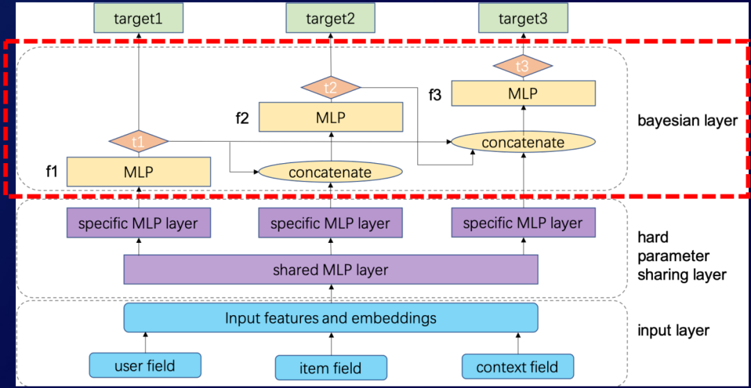 贝叶斯关系的刻画是在target-target层。基本的原理是通过前序目标的输出作为后续目标的输入来刻画它们的转移关系,概率关系的刻画是通过一个简单的MLP(输出的Logits的前一层)来刻画的。