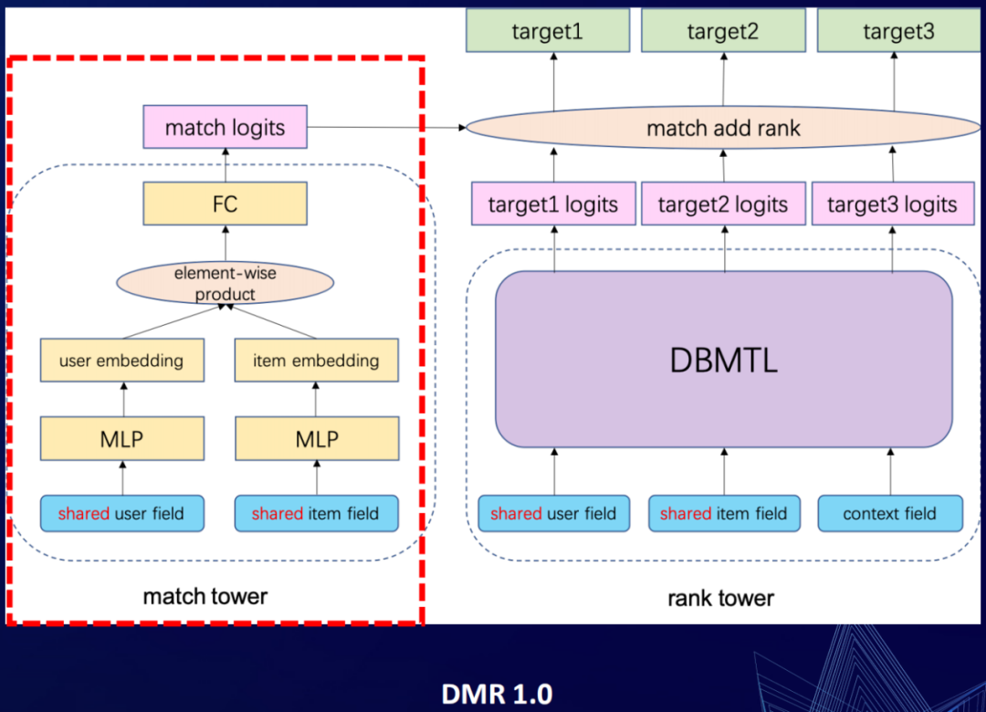 在2.0版本我们就做了简单的优化,左边的match tower,原来是先去刻画user和item的关系,现在直接换成了refer和item的关系刻画,还是原来的点积的框架match tower,只是把原先user的特征换成了refer特征,然后显式的去刻画refer和item的关系。