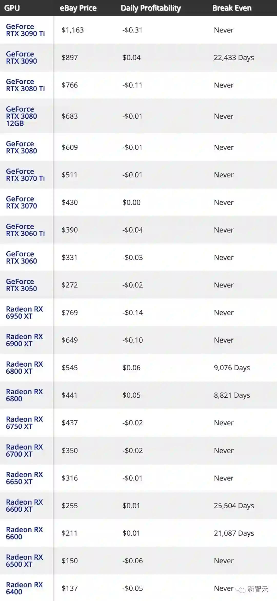 在AMD RX 6000系列和英伟达RTX 30系列的21个当前一代显卡中,目前只有五个在理论上是有利可图的(需要至少20年才能回本),而其余都处于亏损状态。