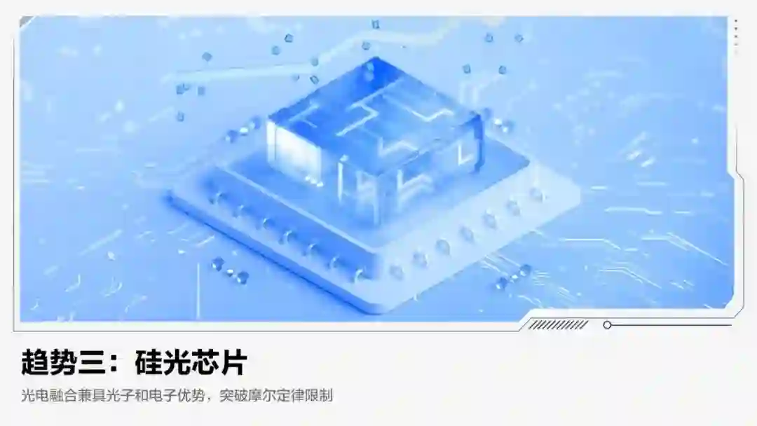 【趋势概要】电子芯片的发展逼近摩尔定律极限,难以满足高性能计算不断增长的数据吞吐需求。硅光芯片用光子代替电子进行信息传输,可承载更多信息和传输更远距离,具备高计算密度与低能耗的优势。随着云计算与人工智能的大爆发,硅光芯片迎来技术快速迭代与产业链高速发展。预计未来三年,硅光芯片将承载绝大部分大型数据中心内的高速信息传输。