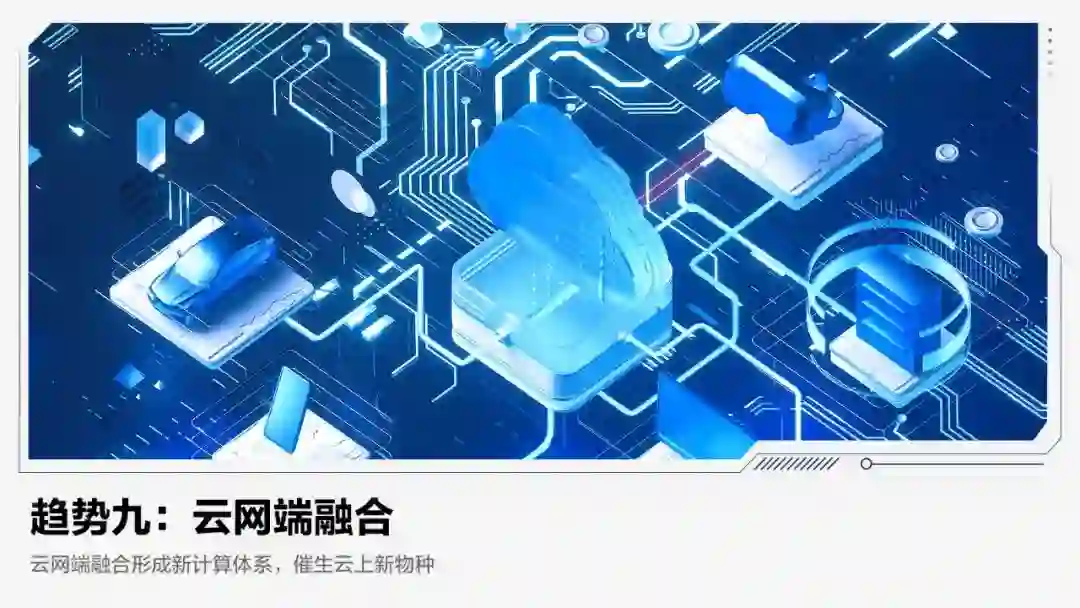【趋势概要】新型网络技术发展将推动云计算走向云网端融合的新计算体系,并实现云网端的专业分工:云将作为脑,负责集中计算与全局数据处理;网络作为连接,将多种网络形态通过云融合,形成低延时、广覆盖的一张网;端作为交互界面,呈现多元形态,可提供轻薄、长效、沉浸式的极致体验。云网端融合将促进高精度工业仿真、实时工业质检、虚实融合空间等新型应用诞生。预计未来两年,将有大量新型应用在云网端融合的新计算体系中运行。
