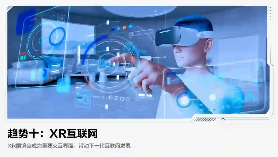 【趋势概要】随着端云协同计算、网络通信、数字孪生等技术发展,以沉浸式体验为核心的XR(未来虚实融合)互联网将迎爆发期。眼镜有望成为新的人机交互界面,推动形成有别于平面互联网的XR互联网,催生从元器件、设备、操作系统到应用的新产业生态。XR互联网将重塑数字应用形态,变革娱乐、社交、工作、购物、教育、医疗等场景交互方式。预计未来三年,外形与重量接近普通眼镜的新一代XR眼镜将产生,成为下一代互联网的关键入口。