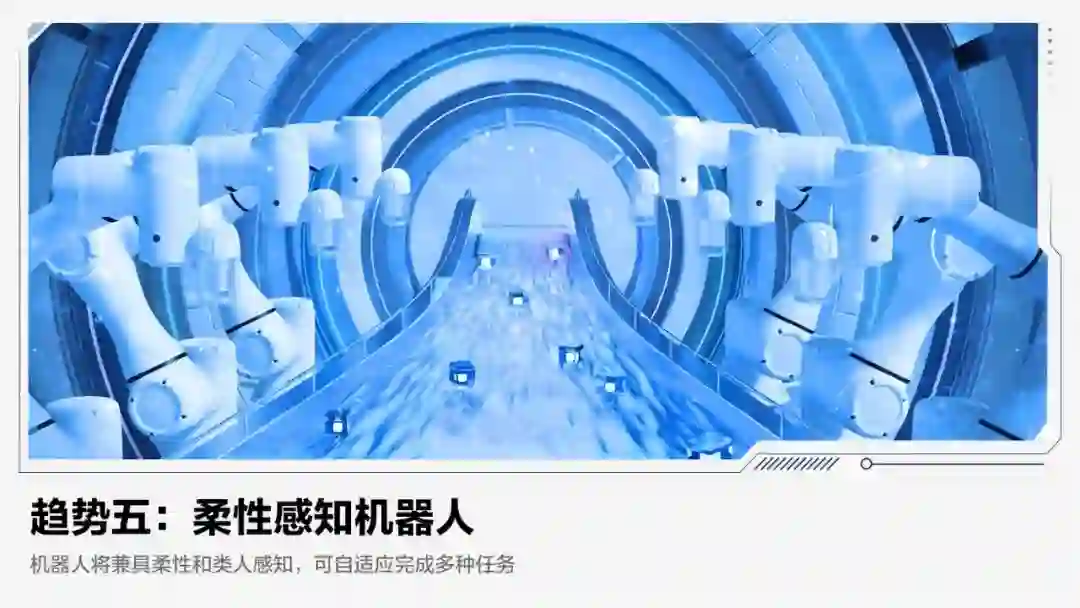 【趋势概要】传统机器人依赖预编程,局限于大型生产线等结构化场景。近年来,柔性机器人结合柔性电子、力感知与控制、人工智能技术,获得了力觉、视觉、声音等感知能力,应对多任务的通用性与应对环境变化的自适应性大幅提升。机器人将从大规模、标准化的产线走向小规模、非标准化的场景。预计未来五年,柔性感知机器人将逐步替代传统工业机器人,成为产线上的主力设备,并在服务机器人领域开始规模化应用。