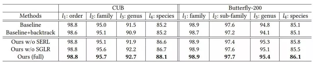 作者首先设计两个没有引入语义嵌入的基准模型 (baseline 和 baseline+backtrack),如表 1,在 Extended CUB 和 Butterfly-200 的数据集上,HSE 框架在两个数据集上的性能始终优于两组对比的基准方法。