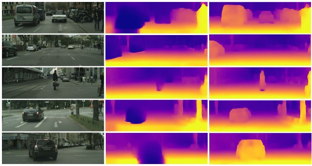 在 Cityscapes 数据集中的深度预测。从左到右依次为:图像、基线、我们的方法和立体传感器提供的实际深度。请注意,立体传感器提供的实际深度有丢失值。另请注意,我们的算法能够在没有实际深度监督的情况下得出这些结果